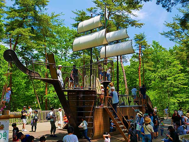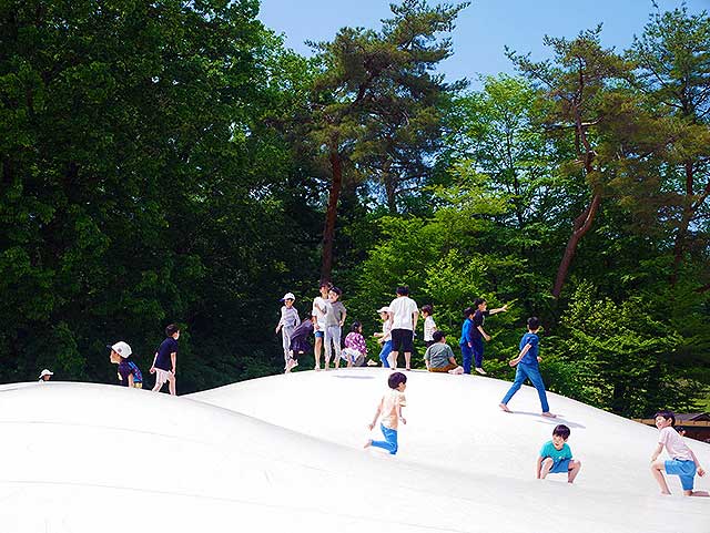 東京ドーム65個分もの広さを誇る森林公園には、日本最大級のエアートランポリン「ぽんぽこマウンテン」や、アスレチックコースなど、思いっきり身体を動かして遊べる遊具がたくさん。