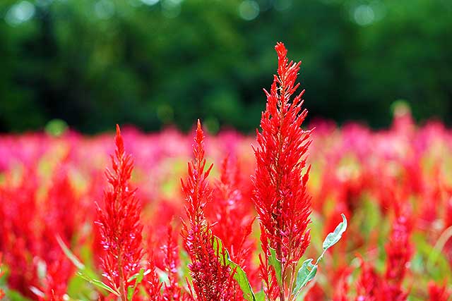 いま、ここ森林公園の西口ひろば花畑では、羽毛ゲイトウ(うもうげいとう)が見ごろをむかえている。きれいな光景は、10月中旬頃まで。