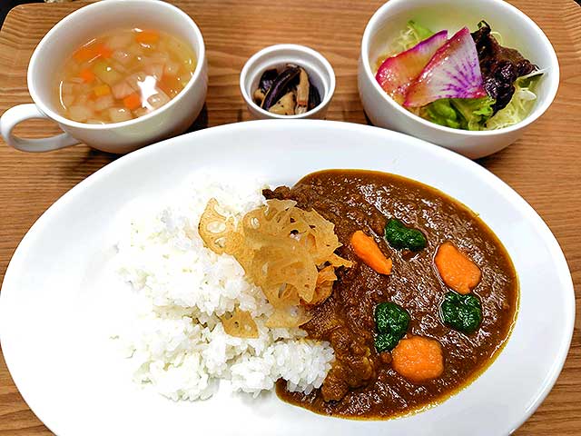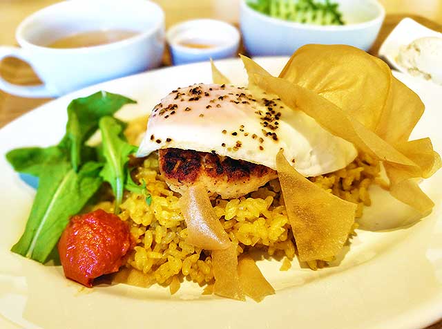 Hearn(ハーン)バーグライス・野菜の副菜・野菜スープ・野菜サラダ・豆乳アイスクリームがセットで、ハンバーグライスは、カレー味のライス、鶏ひき肉と豆腐のハンバーグ、八雲の好物だった目玉焼きが三段重ねに。