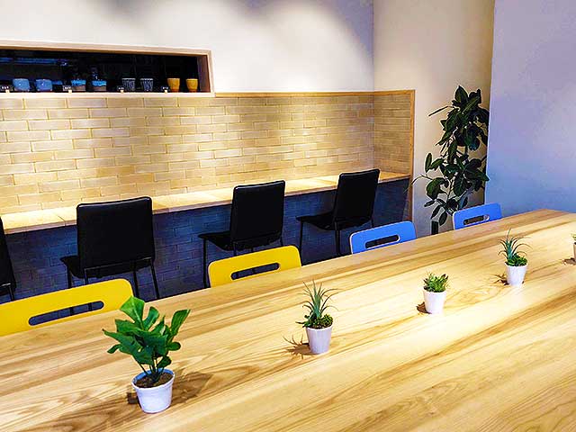 カフェの中央に置いた大きいテーブルでは、会話を楽しみながら食事をしたり外を眺めながらゆっくり飲み物を味わったり。