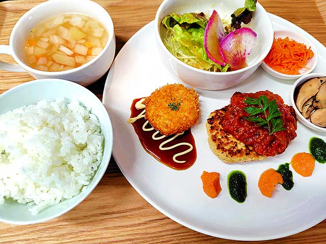 野菜や大豆製品たっぷりの「Hearn(ハーン)バーグランチ」は、ヘルシーながらお腹も満足なカフェごはん。