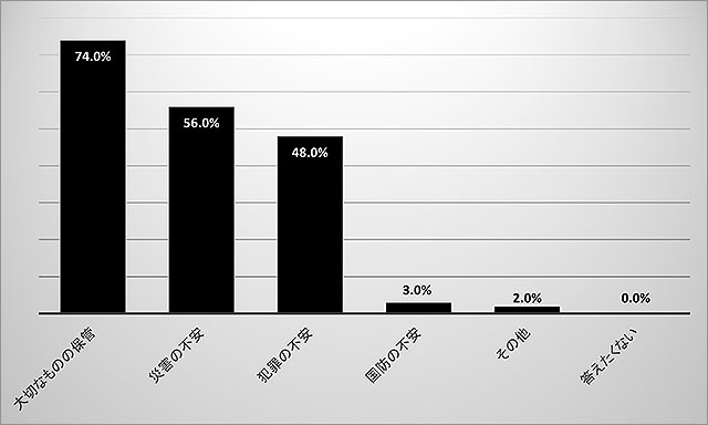 いっぽうで、金庫の購入を検討している人に理由を聞くと「災害の不安(56.0%)」や「犯罪の不安(48.0%)」があげられ、防災・防犯意識による金庫への注目が集まっている。