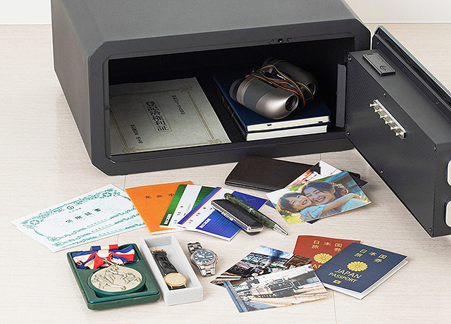 保管したものをスマートに取り出せる、1.指紋、2.暗証番号、3.強制解錠キー の 3種類の方法で解錠が可能。