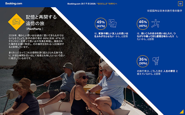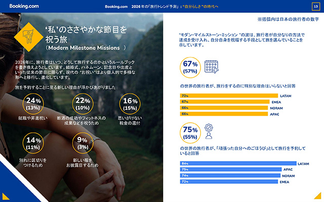 世界の旅行者の4分の3(世界:75%、日本:55%)が、「頑張った自分へのごほうび」として旅行を予約しているほか、旅行を予約する新たな理由も注目を集めています。