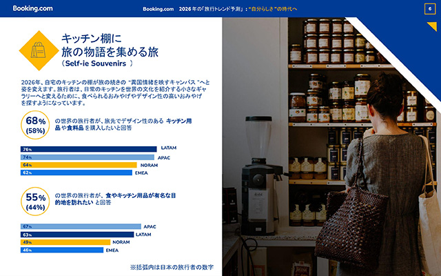 さらに、独自性やスタイルを重んじる旅行者もいて、5人に1人近く(世界:17%、日本:13%)は、珍しいおみやげや限定デザインのキッチンアイテム、棚に置いてもSNS映えするパッケージなどを収集することを目的とした旅先を選んでいます。