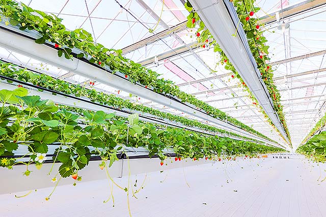 「出雲ICHIGO縁」(島根県出雲市大社町)は、中国地方最大規模となる可動式空宙プランターで約5万株のいちごを栽培。