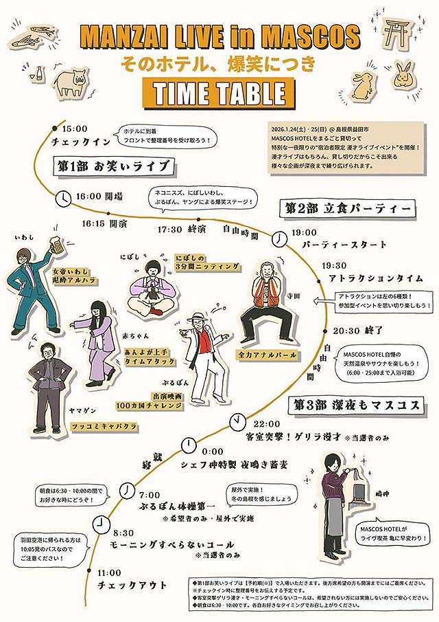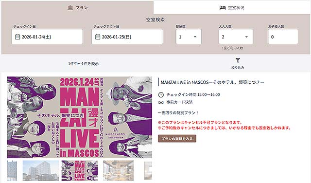 参加は、MASCOS HOTEL(マスコスホテル)公式予約サイトから、宿泊プラン「MANZAI LIVE in MASCOSーそのホテル、爆笑につきー」(チェックイン日2026-01-24(土))を予約。