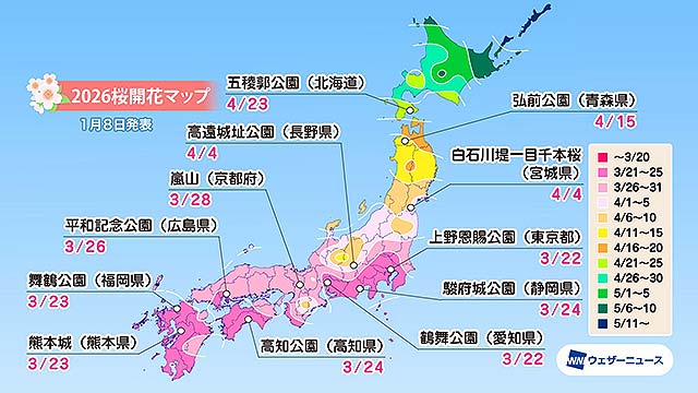 ウェザーニューズ(千葉市美浜区)が桜の季節に向けて「第一回桜開花予想」を発表した内容によると、2026年の桜の開花は西日本で平年並、東日本で平年並〜やや早く、北日本で平年よりもやや早い〜非常に早くなる見込み。